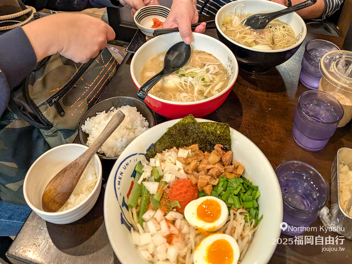 午餐時間,我們選擇了知名的博多拉麵街。這時間有太多上班族要吃飯了,我毅然放棄很想念Shin-Shin拉麵,挑了也是口袋名單的拉麵海鳴。拉麵海鳴以魚介豚骨為主要湯底,我點了辣味明太子拌麵,較粗的麵條口感極佳,雖然味道濃厚,但生韭菜和洋蔥都讓口感不斷變化,是一碗不會膩的麵。